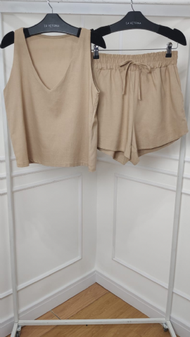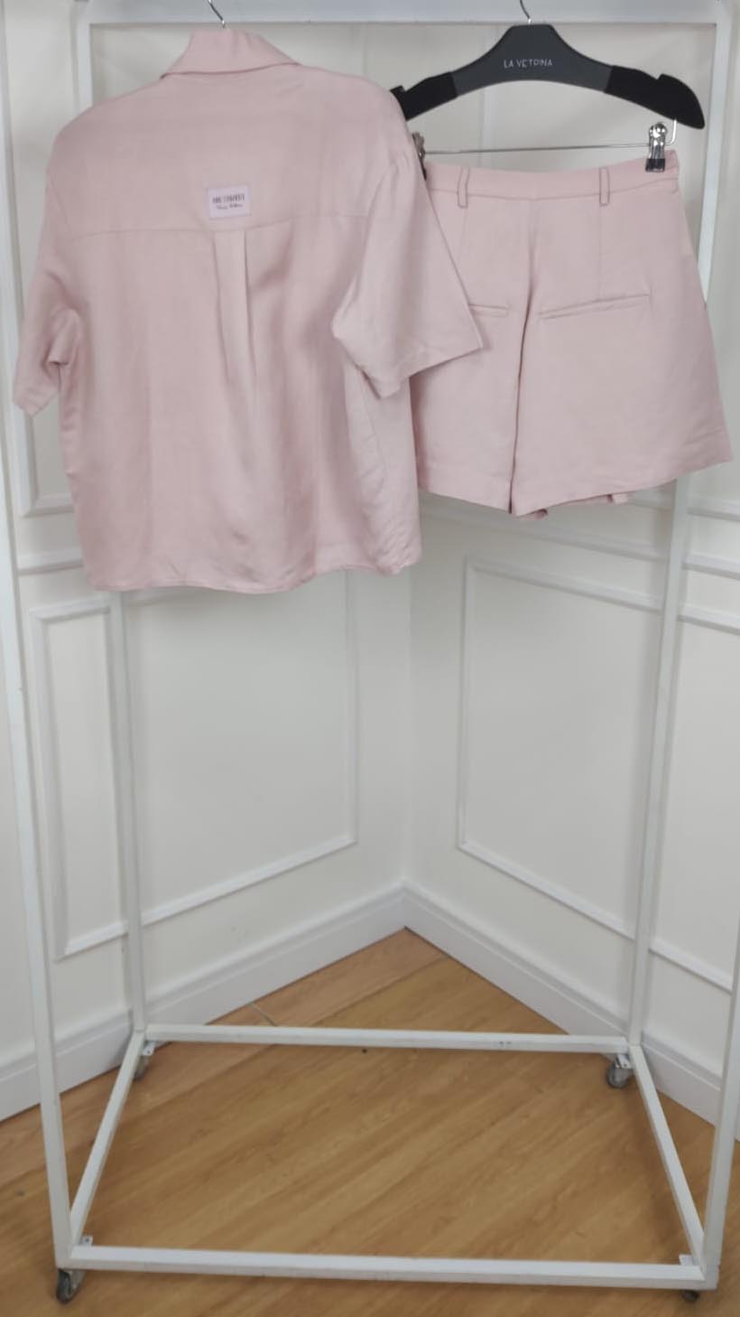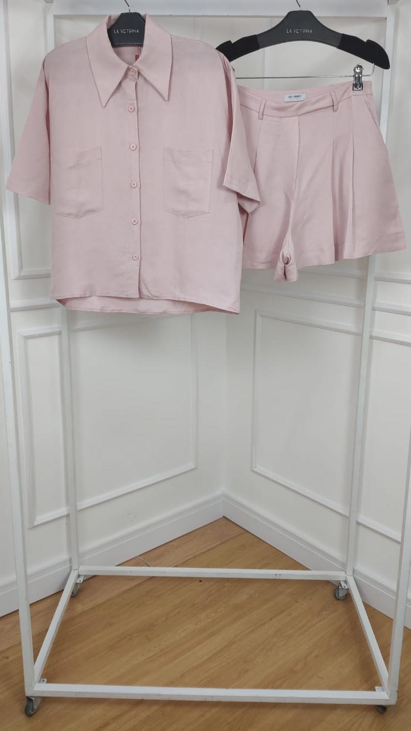 Conjunto composto por camisa e short. Camisa com mangas curtas, gola tradicional, bolsos frontais, prega nas costas e fechamento por botões na frente. Short com modelagem evasê, cintura alta, pregas frontais, bolsos faca laterais, bolsos traseiros decorativos, cós com passantes para cinto, frente simulando um fechamento por zíper e colchete e fechamento por zíper invisível na lateral.